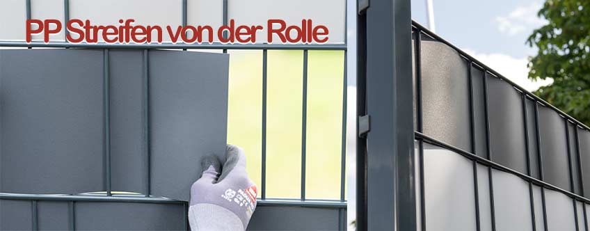 Die Sichtschutzstreifen werden mit Kleber bzw. Klemmschienen am Ende der selbst eingeflochtenen PVC - Sichtschutzstreifen am Gittermattenzaun angebracht. So finden die flexiblen Sichtschutzstreifen ihren richtigen Halt "fast von selber" im Sichtschutzzaun. Die eingeflochtenen Sichtschutzstreifen liegen fest und stramm in den Gitterstäben Ihrer Zaunmatten. Mit der Abrollhilfe ganz einfach abrollen.